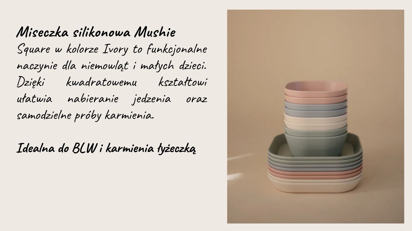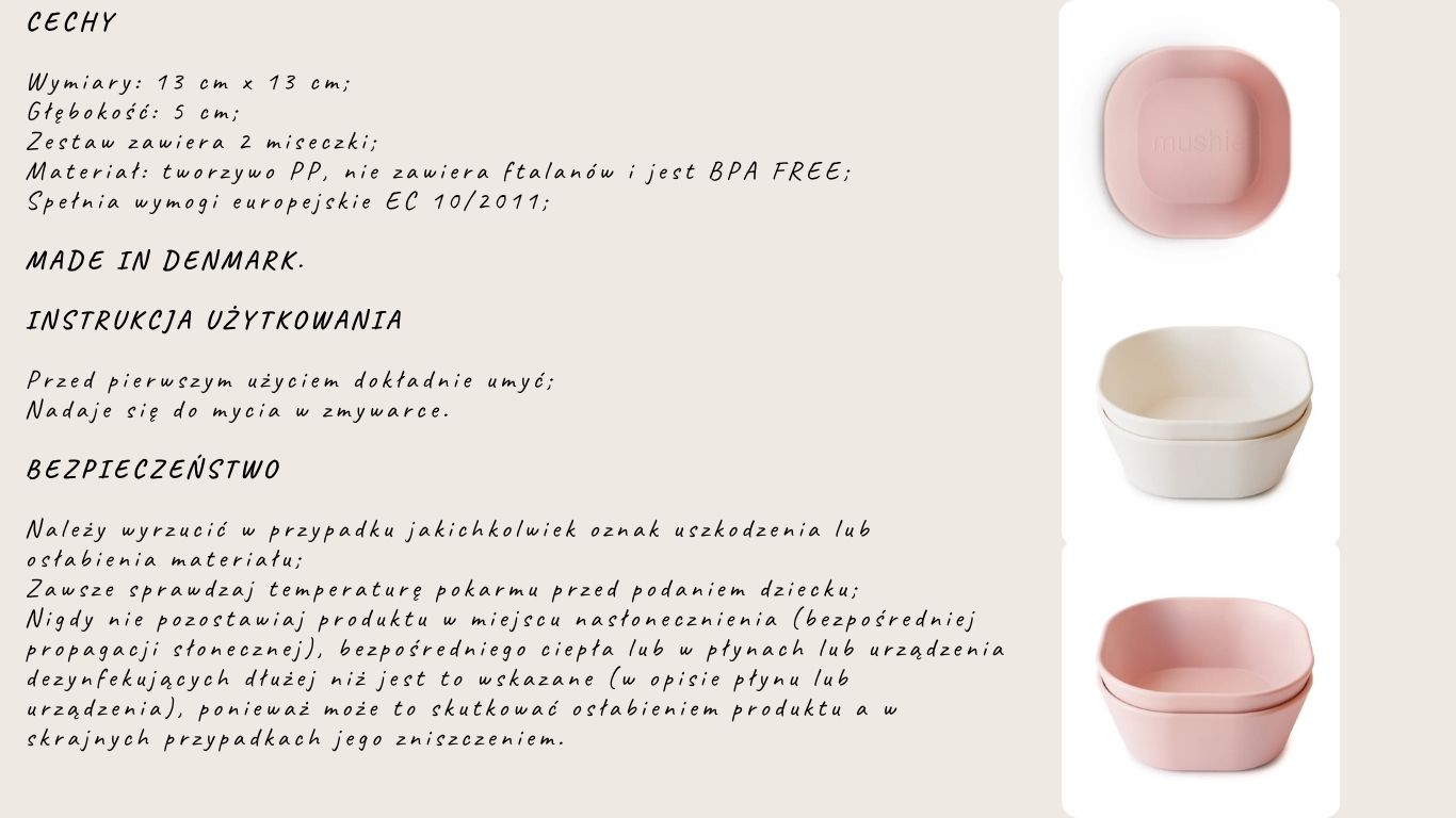 Stwórz piękną zastawę stołowa dla Twojego dziecka! Stylowe miseczki SQUARE charakteryzują się delikatną kolorystyką inspirowaną naturą, oraz delikatnym designem. Połączenie tych dwóch cech, sprawia że talerzyki są eleganckie i minimalistyczne pasując do każdego nowoczesnego domu. Idealnie pasują do sylikonowych śliniaczków Mushie.